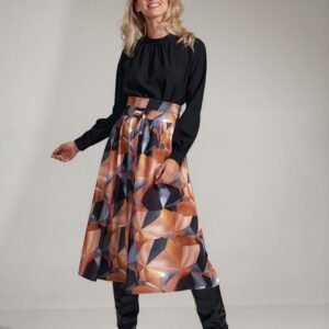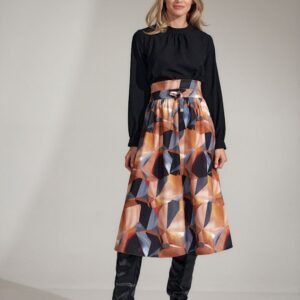 Czarna bluzka na stójce z delikatnym marszczeniem pod szyją, długi marszczony rękaw zakończony mankietem zapinanym na guzik, zapinana z tyłu na kryty zamek.