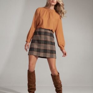 Brązowa bluzka na stójce z delikatnym marszczeniem pod szyją, długi marszczony rękaw zakończony mankietem zapinanym na guzik, zapinana z tyłu na kryty zamek.