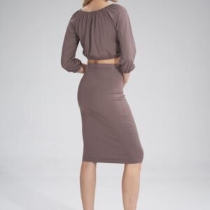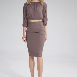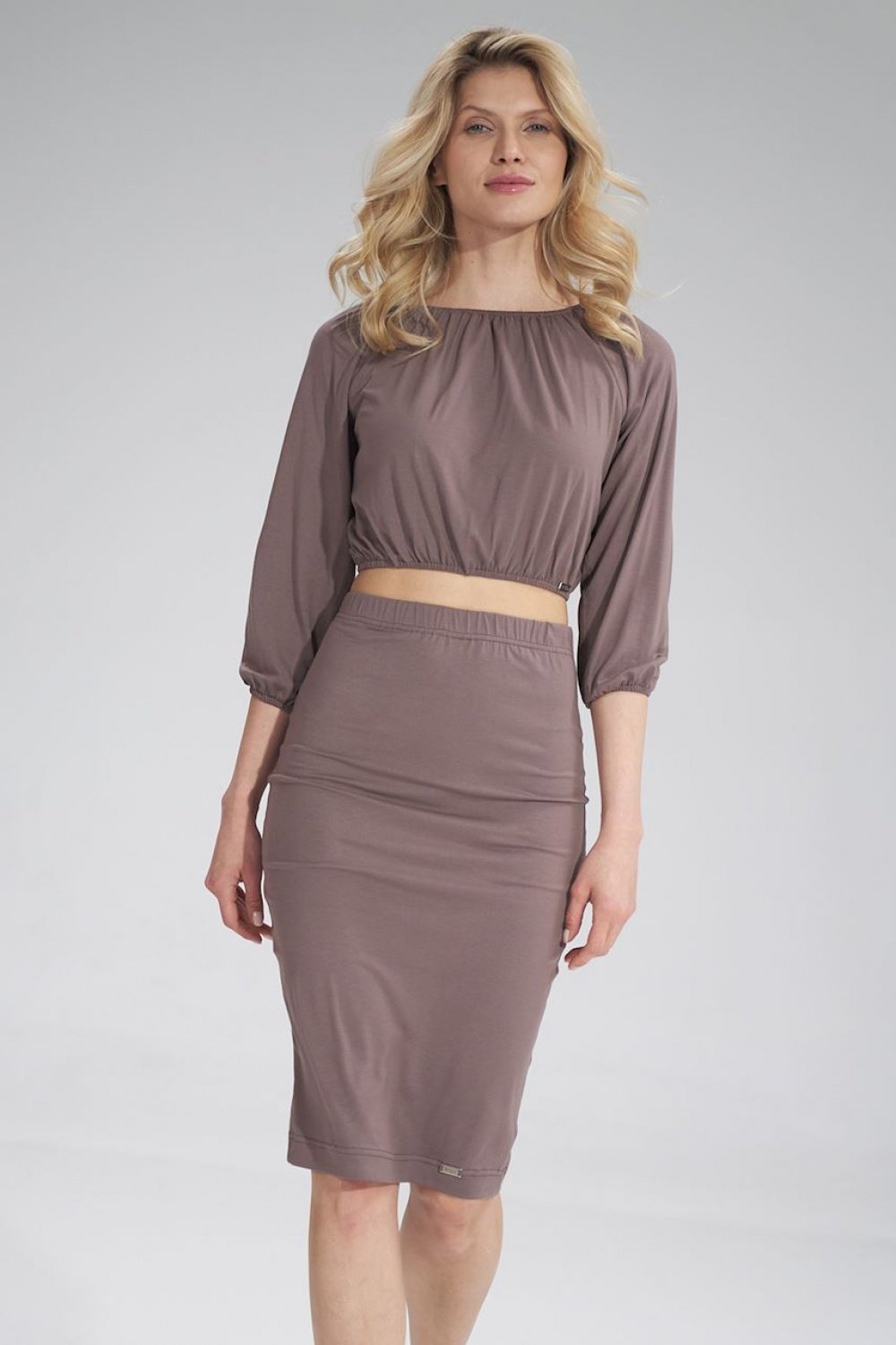 Krótka bluzka z rękawem 3/4. Dekolt, rękawy i dół bluzki marszczony i wykończony wszytą gumką.