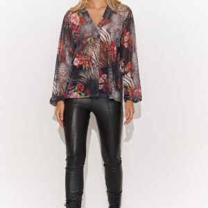Siatkowa bluzka damska o luźnym fasonie, dostępna w 5-u wzorach o różnych motywach i ciekawej kolorystyce. Posiada dekolt w serek i swobodne długie rękawy. Możesz ją nosić na różne okazje, z jeansami sprawdzi się w stylizacjach na luzie, a z eleganckimi spodniami lub spódnicą i szpilkami, wykreuje niezwykły zestaw na wyjątkowe wyjście! Podkreśli Twoją elegancję i skomponuje się idealnie z Twoim stylem. Połącz wygodę z wyrafinowaniem i ciesz się modą jak nigdy wcześniej.