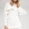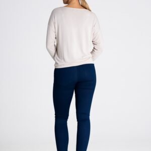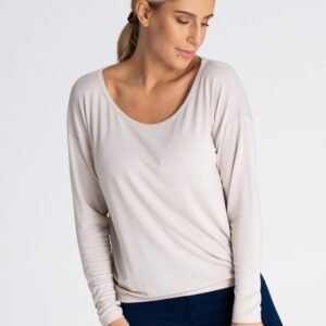Bluzka z delikatnej tkaniny z długim rękawem oraz okrągłym dekoltem. Luźny fason z opadającym ramieniem. W dole wszyta gumka.