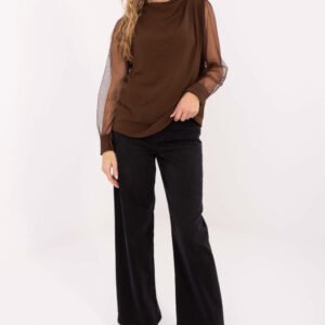 Elegancka bluzka o subtelnym, kobiecym stylu, idealna na wizytowe okazje oraz do pracy. Uszyta z gładkiej tkaniny będącej mieszanką poliestru i elastanu, która zapewnia wygodę i delikatnie dopasowuje się do sylwetki. Bluzka ma okrągły dekolt, a jej ozdobą są efektowne, długie rękawy z siateczki, które dodają lekkości i elegancji. Bufiaste rękawy z ozdobnymi marszczeniami na ramionach i delikatnymi guzikami nadają całości wyjątkowego charakteru. Standardowa długość sprawia, że bluzka świetnie komponuje się zarówno ze spódnicami, jak i spodniami, tworząc szykowne stylizacje.