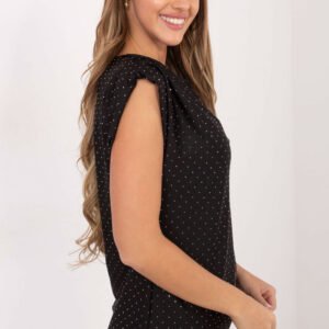 Elegancka damska bluzka to efektowna propozycja stworzona na wizytowe okazje oraz imprezy, gdzie liczy się szyk i wyjątkowy charakter stylizacji. Wykonana z połączenia poliestru i elastanu, zapewnia delikatną elastyczność, gładkie układanie materiału oraz komfort przez cały dzień. Model o standardowej długości i bez rękawów został wzbogacony o poduszki na ramionach, które pięknie podkreślają linię sylwetki, dodając jej struktury i elegancji. Subtelny lejący dekolt nadaje bluzce kobiecego, zmysłowego wyrazu. Całą powierzchnię materiału zdobi aplikacja z dżetów, dzięki czemu bluzka efektownie połyskuje i przyciąga wzrok. Brak zapięcia sprawia, że model jest wygodny i łatwy do założenia. Stylowa, wyjątkowa i idealna na specjalne wyjścia świetnie sprawdzi się w zestawieniu z eleganckimi spodniami lub spódnicą.