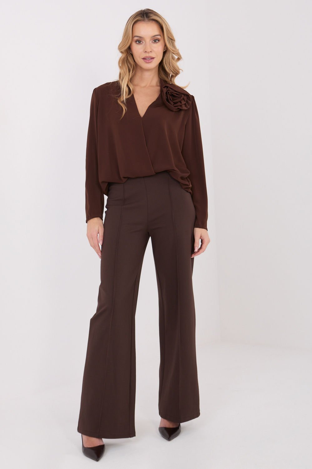 Wyrafinowana i stylowa bluzka, która doskonale sprawdzi się podczas wizytowych okazji oraz w pracy. Wykonana z wysokiej jakości mieszanki poliestru, wiskozy i elastanu, gwarantuje wygodę noszenia oraz elegancki wygląd przez cały dzień. Elegancki styl, idealny na formalne spotkania, uroczystości czy do biura. Dekolt w serek, który subtelnie podkreśla linię szyi i dekoltu, dodając bluzce kobiecego charakteru. Długi rękaw, odpowiedni na każdą porę roku. Dół wykończony gumką, który zapewnia dopasowanie oraz nadaje całości delikatnie luźny, ale zrównoważony fason. Ozdobny kwiat z materiału na przodzie, stanowiący efektowny akcent, podkreślający unikalny design. Bluzka o standardowej długości idealnie komponuje się z eleganckimi spodniami, spódnicami lub jeansami, tworząc szykowne i uniwersalne stylizacje. To niezastąpiony element garderoby każdej kobiety, która ceni elegancję i wygodę.