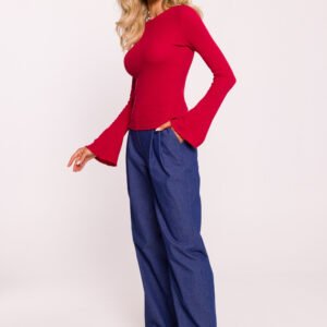 Dopasowana bluzka wykonana z prążkowanej dzianiny bawełnianej, idealna na codzienne stylizacje. Posiada długie rękawy, które są lekko poszerzone u dołu i wykończone dekoracyjnym obszyciem, dodającym subtelnej elegancji. Zaprojektowana i uszyta w Polsce, bluzka łączy w sobie komfort i styl.