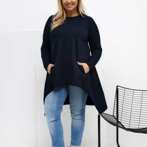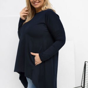 Asymetryczna bluzka plus size w stylu casual to idealna propozycja na co dzień, łącząca wygodę z modnym wyglądem. Model z krótszym przodem i dłuższym tyłem subtelnie wysmukla sylwetkę oraz zapewnia swobodę ruchów. Gładki fason sprawia, że bluzka jest uniwersalna i łatwa do stylizacji, świetnie sprawdzi się zarówno z jeansami, jak i legginsami. Wykonana z wysokiej jakości bawełny z dodatkiem elastanu, jest miękka, oddychająca i elastyczna, dzięki czemu doskonale dopasowuje się do figury. Długi rękaw i klasyczny, okrągły dekolt podkreślają jej codzienny charakter. Praktycznym atutem są kieszenie ukryte w szwach bocznych, które dodają funkcjonalności i nowoczesnego akcentu. Bluzka nie posiada zapięcia, co zwiększa komfort noszenia i podkreśla jej luźny, swobodny styl.