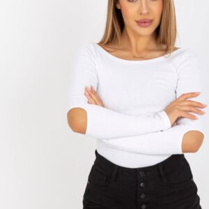 Bluzka z długim rękawem oraz dekoltem w łódkę. Na łokciach ozdobne rozcięcia. Na plecach głębokie wycięcie.