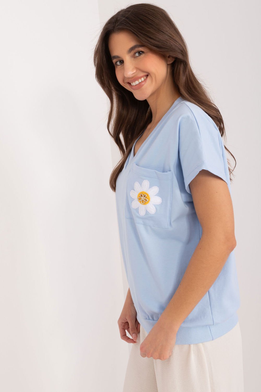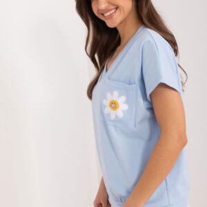 Ta codzienna bluzka to doskonały element garderoby dla tych, którzy cenią sobie wygodę w casualowym stylu, nie rezygnując przy tym z delikatnych akcentów. Jej gładki materiał z bawełny zapewnia komfort noszenia i oddychalność, sprawiając, że jest idealna na codzienne wyjścia. Bluzka ma standardową długość, co sprawia, że jest uniwersalna i odpowiednia na wiele różnych okazji. Krótki rękaw oraz dekolt w serek nadają jej swobodnego i przyjemnego charakteru, idealnie pasując do letnich dni. Główny element ozdobny to haftowany kwiat wraz z cyrkoniami umieszczonymi na kieszonce na wysokości piersi. To subtelne, ale efektowne detale dodają bluzce wyjątkowego uroku i nadają jej delikatności. Dodatkowo, kieszeń na wysokości piersi jest praktycznym elementem, umożliwiającym przechowywanie najpotrzebniejszych drobiazgów. Ta bluzka to doskonały wybór dla osób poszukujących komfortowej, ale stylowej odzieży na co dzień, dodając delikatnego uroku nawet najprostszym casualowym stylizacjom.