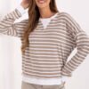 Dopasowana bluzka z prążkowanego materiału, doskonała na co dzień oraz do pracy, w eleganckim stylu. Wykonana z wysokiej jakości mieszanki bawełny i elastanu, zapewnia komfort i idealne dopasowanie do sylwetki. Bluzka ma gładki wzór, standardową długość oraz długie rękawy. Dekolt w serek oraz mankiety są ozdobione subtelnym motywem zwierzęcym, co nadaje całości wyrazistego charakteru. Dodatkowo, przy nadgarstkach oraz dekolcie znajdują się guziki, które pełnią funkcję ozdobną. Prążkowany materiał dodaje elegancji, a nadruk w postaci motywu zwierzęcego podkreśla unikatowość tego modelu.