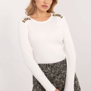 Dopasowana bluzka z prążkowanego materiału, idealna na co dzień i do pracy, łącząca elegancję z nowoczesnym stylem. Wykonana z wysokiej jakości mieszanki bawełny i elastanu, doskonale układa się na sylwetce, zapewniając komfort noszenia. Bluzka ma standardową długość, długi rękaw oraz klasyczny okrągły dekolt. Na ramionach znajduje się efektowny motyw zwierzęcy, który dodaje całości wyrazistości i charakteru. Dodatkowo ozdobiona guzikami na ramionach, wprowadza subtelny, dekoracyjny akcent. Brak zapięcia sprawia, że model jest wygodny i łatwy do noszenia, doskonale łącząc styl elegancki z casualowym.