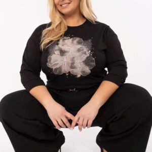 Ta casualowa bluzka to połączenie wygody z modnym, ozdobnym akcentem. Wykonana z miękkiej i elastycznej tkaniny (bawełna z dodatkiem elastanu), doskonale układa się na sylwetce i zapewnia komfort przez cały dzień. Model o standardowej długości z rękawem 3/4 oraz klasycznym, okrągłym dekoltem pasuje do wielu codziennych stylizacji. Przód bluzki zdobi efektowny nadruk wzbogacony aplikacją z błyszczących dżetów i cyrkonii, które dodają całości eleganckiego wykończenia. Brak zapięcia sprawia, że bluzka jest łatwa do zakładania i bardzo praktyczna.