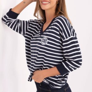 Casualowa bluzka damska w paski z naszywką na przodzie to wygodna i stylowa propozycja na codzienne okazje. Wykonana z miękkiego micro modalu z dodatkiem elastanu zapewnia komfort noszenia i swobodę ruchów przez cały dzień. Model o standardowej długości z rękawem 3/4 i dekoltem w serek łączy klasyczny fason z modnym detalem w postaci naszywki, dzięki czemu świetnie sprawdzi się w casualowych stylizacjach, zarówno ze spodniami, jak i spódnicą.