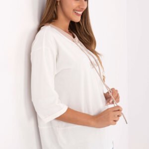 Casualowa bluzka damska z haftem na przodzie i troczkami przy dekolcie to stylowa propozycja na codzienne okazje. Wykonana z miękkiej bawełny z dodatkiem elastanu zapewnia komfort noszenia i swobodę ruchów przez cały dzień. Model o standardowej długości z rękawem 3/4 i klasycznym okrągłym dekoltem łączy prostotę z modnym detalem, dzięki czemu świetnie sprawdzi się w codziennych, casualowych stylizacjach, zarówno ze spodniami, jak i spódnicą.