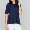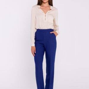 Elegancka bluzka z tkaniny satynowej, zakładana przez głowę, wyposażona w stójkę, która dodaje szyku. Dekolt zdobi subtelne, ozdobne przeszycie, a na piersi znajduje się praktyczna kieszonka. Długie rękawy zakończone są mankietami zapinanymi na jeden guzik, co podkreśla dbałość o detale. Dół bluzki ma półokrągłe wykończenie, z przodem krótszym niż tył, co nadaje jej nowoczesnego i stylowego wyglądu. Bluzka została zaprojektowana i uszyta w Polsce, idealna do eleganckich i casualowych stylizacji.