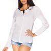 Elegancka bluzka z delikatnej tkaniny. Przy dekolcie przedłużana stójka wiązana na kokardkę. Rękaw oraz dół delikatnie ściągnięty.