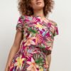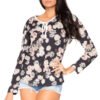 Bluzka wiązana na szyi uszyta z delikatnej tkaniny. Dekolt prosty odsłaniający ramiona zmarszczony gumką, dzięki czemu bluzka pozostaje na swoim miejscu, rękawy długości 7/8. Bluzka na lato, która uwodzi zmysłowością.