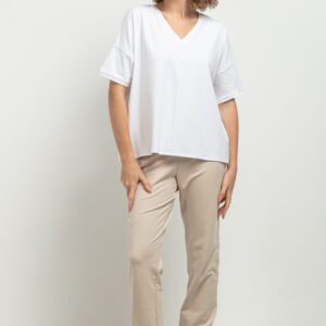 Luźna bluzka z kobiecym dekoltem V. Rękaw opadający, wykończony delikatnym mankiecikiem. Przy dekolcie ozdobna plisa. W wersji w paski plisa w kolorze białym co dodatkowo czyni bluzkę elegantszą. Idealna do stylizacji eleganckich jak i tych bardziej casualowych. Można nosić na zewnątrz jak i włożyć delikatnie do spodni lub do spódnicy. To nasz MUST HAVE na każdą okazję. Bluzka jest szyta w Polsce z dzianiny z certyfikatem OEKO-TEX Standard 100. Dzianina bawełniana polskiej produkcji o wysokiej jakości.