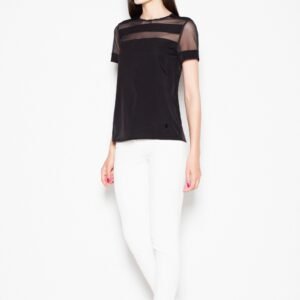 Szykowna bluzka z krótkim rękawem z półokrągłym dekoltem. Posiada ozdobne, prześwitujące elementy przy dekolcie i rękawach. Model wykonany z doskonałej jakości materiału.