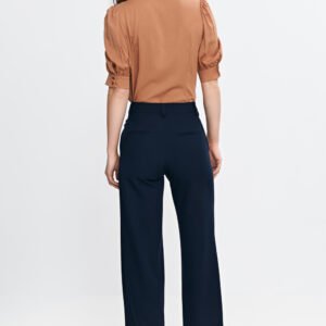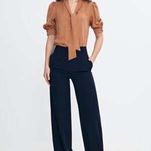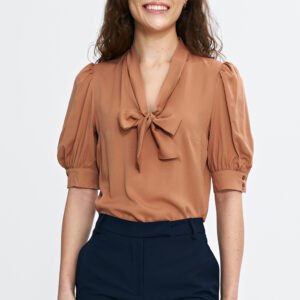 Stylowa bluzka o regularnym kroju, wykonana z lekkiej i przewiewnej wiskozy. Dekolt w kształcie litery V z ozdobnym wiązaniem dodaje elegancji i subtelnie podkreśla szyję. Rękawy o długości przed łokieć z delikatnymi bufkami i mankietem nadają całości kobiecego charakteru. Model wkładany przez głowę, idealny zarówno do codziennych, jak i bardziej eleganckich stylizacji.