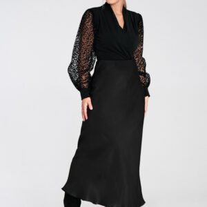 Body z kopertowym dekoltem w serek, które subtelnie podkreśla sylwetkę. Ozdobne, długie rękawy dodają mu elegancji i wyjątkowego charakteru, tworząc stylowy i kobiecy element garderoby.