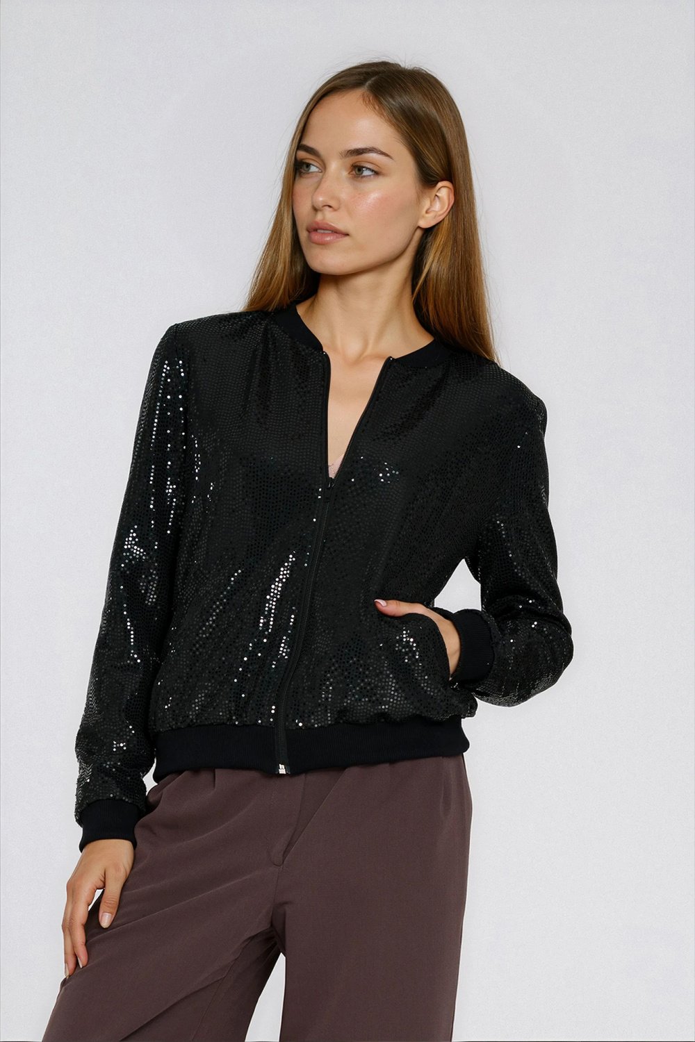 Stylowa bluza damska o kroju regular, łącząca komfort noszenia z modnym, efektownym wyglądem. Wykonana z materiału zdobionego klejonymi cekinami, przyciąga uwagę subtelnym blaskiem i nadaje stylizacji wyjątkowego charakteru. Model z okrągłym dekoltem pod szyję, wykończonym elastycznym ściągaczem, zapewnia wygodne dopasowanie. Długie rękawy zakończone ściągaczami podkreślają sportowo-elegancki styl bluzy. Zapinana z przodu na zamek, jest praktyczna i łatwa w użytkowaniu. Idealna propozycja do nowoczesnych, casualowych stylizacji z nutą glamour.