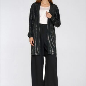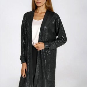 Efektowna narzutka o modnym kroju oversize, która doskonale łączy wygodę z wyrazistym stylem. Wykonana z materiału zdobionego klejonymi cekinami, zachwyca połyskiem i nadaje stylizacji charakteru glamour. Luźny fason zapewnia swobodę ruchów i nowoczesny wygląd. Model z długimi rękawami zakończonymi ściągaczami gwarantuje komfort noszenia oraz lekko sportowe wykończenie. Niezapinana forma sprawia, że narzutka układa się naturalnie i świetnie dopełnia zarówno codzienne, jak i wieczorowe stylizacje. Idealna jako efektowny element garderoby na wyjątkowe okazje.