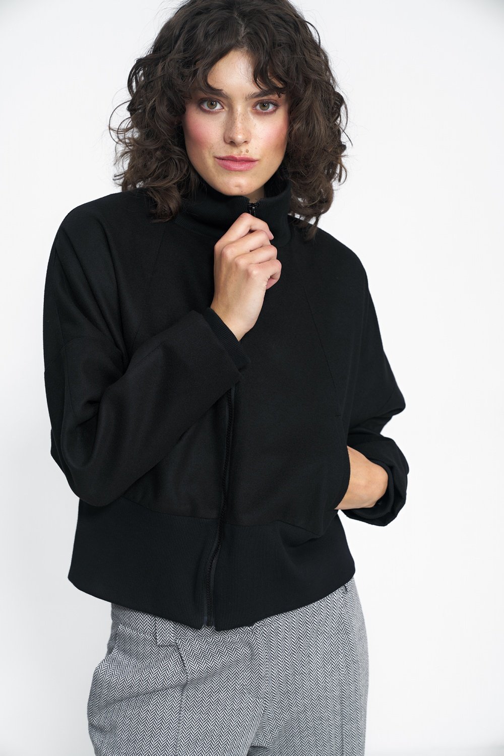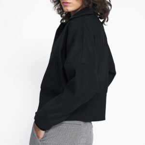 Czarna kurtka ma krótki, prosty fason, który świetnie prezentuje się w połączeniu ze spodniami i spódnicami z wysokim stanem. Minimalistyczny fason dobrze sprawdza się w jesiennych, miejskich stylizacjach na dzienne i wieczorowe okazje. Kurtka ma modne i praktyczne przeszycia oraz wygodne kieszenie. To ponadczasowy element garderoby.