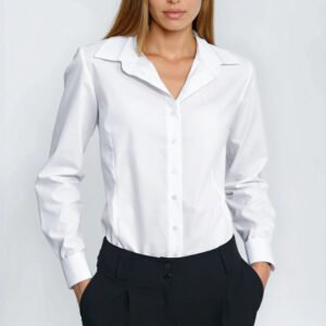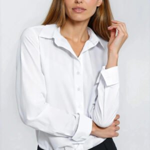Elegancka biała koszula z kołnierzykiem wykonana z gładkiego i przyjemnego w dotyku materiału. Ma taliowany fason z długimi rękawami, które są zakończone mankietami. Koszula doskonale sprawdzi się w garniturowych stylizacjach, to idealna baza biznesowej garderoby.