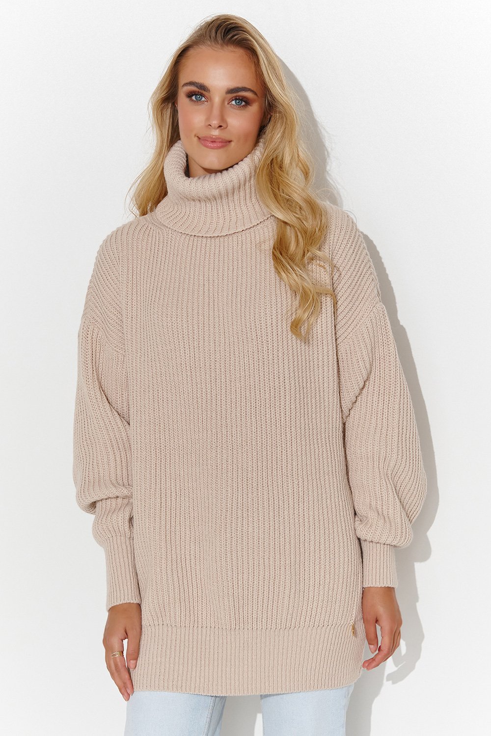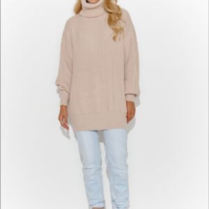 Klasyczny gruby damski sweter z długimi rękawami i mięsistym golfem to doskonała propozycja na chłodniejsze dni. Wykonany na małych oczkach, posiada prosty i regularny wzór: zarówno z przodu, jak i z tyłu. Jego miękka faktura otula ciało, zapewniając ciepło i komfort. Dostępny w różnorodnych wariantach kolorystycznych, takich jak: cappuccino, nude, czarny, śmietankowy, niebieski, zielony i pomarańczowy. Szeroki wybór umożliwi Ci wybranie idealnego odcienia pasującego do Twojej urody i garderoby. Dyskretna złota blaszka umieszczona po boku w dolnej części dodaje swetrowi elegancji. Sweter doskonale współgra z wygodnymi jeansami, spodniami dresowymi oraz sportowymi butami, tworząc wyjątkowe połączenia na co dzień.
