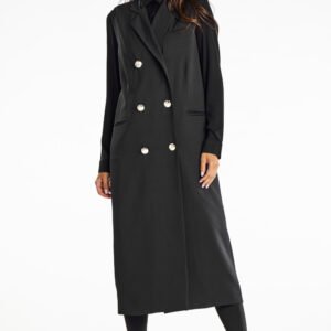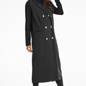 Elegancka, kamizelka dwurzędowa maxi. Dodaj wyjątkowego charakteru swojej garderobie z elegancką, dwurzędową kamizelką maxi, która łączy klasykę z nowoczesnym designem. Dzięki dwurzędowemu zapięciu na guziki i długiej sylwetce, kamizelka podkreśla kobiecy styl. Noszona jako sukienka lub stylowy element codziennych stylizacji, idealnie sprawdzi się na różne okazje, od casualowych dni po eleganckie kolacje. Kamizelka uszyta z wysokiej jakości tkaniny z elegancką podszewką zapewnia wygodę i doskonałe dopasowanie. Klasyczny kolor i minimalistyczny design umożliwiają różnorodne stylizacje, od jeansów po eleganckie spodnie.