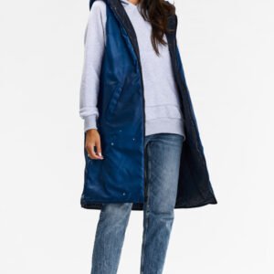Dwustronna kamizelka z kapturem, zapinana na zamek to doskonałe połączenie elegancji i praktyczności. Długi krój i kaptur zapewniają komfort i ochronę przed chłodem, a dwustronność daje możliwość zmiany stylu. Kamizelka sprawdzi się idealnie na co dzień, na zakupy, do pracy czy na uczelnię.