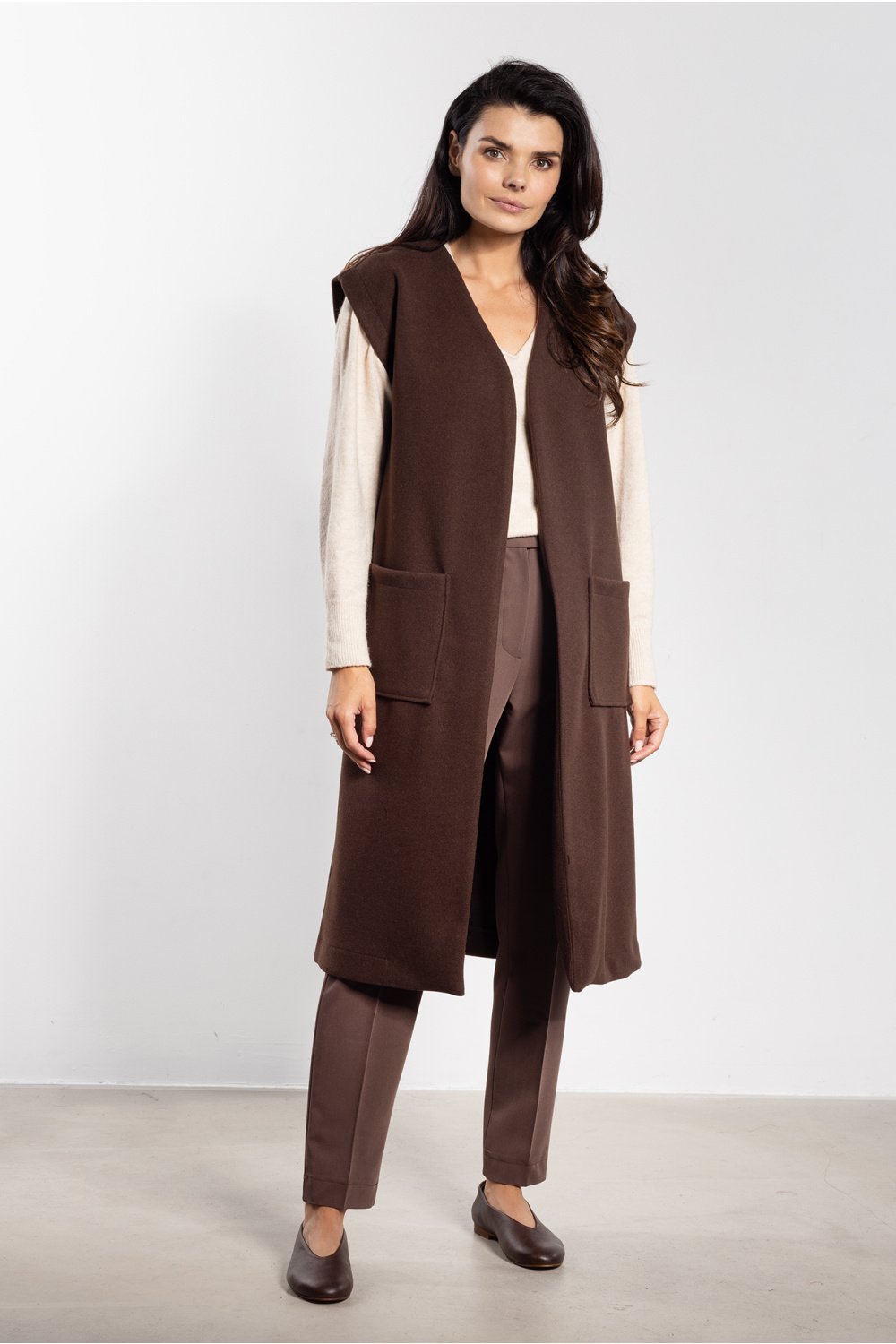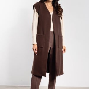 Długa kamizelka damska z miękkiego flauszu to idealny wybór na chłodniejsze dni jesieni. Prosty, minimalistyczny krój sprawia, że świetnie komponuje się zarówno z eleganckimi spodniami, jak i casualowymi jeansami. Dołączony pasek pozwala podkreślić talię, ale kamizelkę można nosić także luźno, tworząc swobodny, nowoczesny look. Duże praktyczne kieszenie i rozcięcia po bokach zwiększają funkcjonalność i dodają modnego charakteru. Polska produkcja i staranne wykończenie gwarantują wysoką jakość.