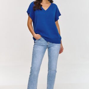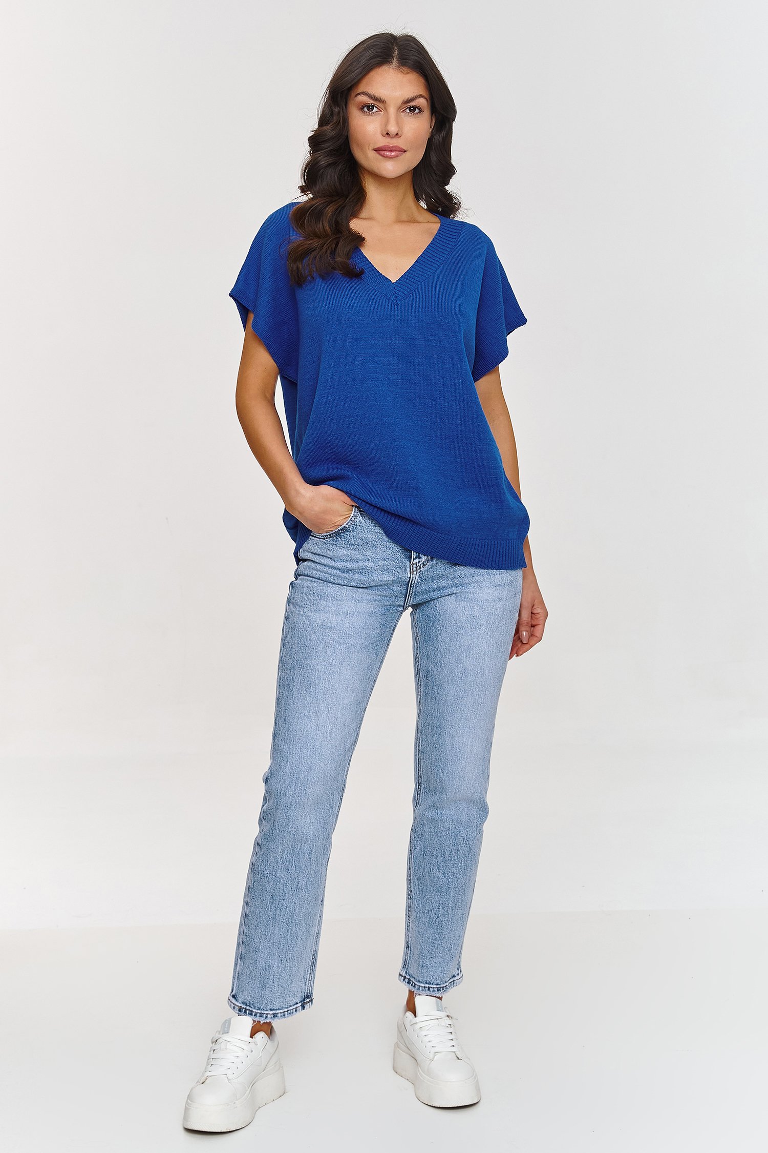 Ta kamizelka swetrowa to stylowy i wygodny element garderoby, który z pewnością doda świeżości każdej stylizacji. Wykonana z miękkiego materiału, zapewnia komfort noszenia przez cały dzień. Dekolt w kształcie V to jeden z najbardziej eleganckich i uniwersalnych fasonów, który delikatnie wydłuża szyję i dodaje lekkości całej stylizacji. Model ma luźny, oversizeowy fason, który idealnie pasuje do różnych typów sylwetek, zapewniając komfort i swobodę ruchów. Krótki rękaw w formie szerokich rękawów wprowadza modny, casualowy akcent, który jest idealny na cieplejsze dni, a także świetnie sprawdza się w warstwowaniu na chłodniejsze dni. Wykonana z mieszanki włókien, w tym PBT, kamizelka ma wyjątkowe właściwości. PBT jest włóknem, które zachowuje swój kształt i strukturę przez długi czas, co sprawia, że nie traci na estetyce i jest bardziej trwały. Dzięki elastyczności PBT, model idealnie dopasowuje się do sylwetki, zapewniając wygodę i komfort przez cały dzień. Kamizelka swetrowa nie tylko wygląda modnie, ale także jest funkcjonalna i wygodna. Możesz ją łączyć z różnymi elementami garderoby, od casualowych jeansów po eleganckie spódnice, tworząc stylizacje na różne okazje.