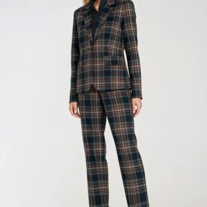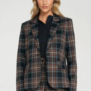 Elegancki żakiet o dopasowanym kroju fit, który subtelnie podkreśla sylwetkę. Wyposażony w klasyczny kołnierz z klapami, długi rękaw oraz wszyte poduszki na ramionach, dzięki czemu całość zyskuje nienaganną, wyrazistą linię. Żakiet zapinany jest na jeden guzik, co dodaje mu minimalistycznej elegancji. Z przodu znajdują się praktyczne kieszenie z klapą. Model sięga do linii bioder i został wykończony podszewką, co zapewnia komfort noszenia i idealne układanie się tkaniny. Całość zdobi ponadczasowa granatowa kratka, nadająca mu szykownego, a jednocześnie nowoczesnego charakteru.