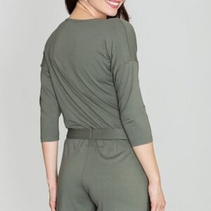 Kombinezon z wygodnej w noszeniu dzianiny. Model z rękawem 3/4, fason kopertowy z głęboko wyciętym dekoltem w literę V, który wydłuży sylwetkę. Posiada wpuszczone kieszenie na bokach. Talia zaznaczona wiązanym paskiem, spodnie krótkie.