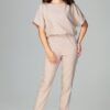 Klasyczny kombinezon bez rękawów, z przodu z wykładanymi wąskimi klapami, kopertowy dekolt. Zapinany z tyłu na kryty zamek. W pasie dwie zaszewki oraz dwa ozdobne metalowe zatrzaski w kolorze srebrnym. Spodnie z bocznymi, skośnymi kieszeniami.