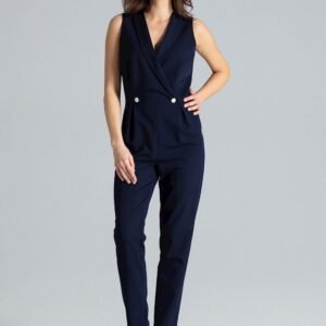 Klasyczny kombinezon bez rękawów, z przodu z wykładanymi wąskimi klapami, kopertowy dekolt. Zapinany z tyłu na kryty zamek. W pasie dwie zaszewki oraz dwa ozdobne metalowe zatrzaski w kolorze srebrnym. Spodnie z bocznymi, skośnymi kieszeniami.