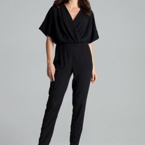 Czarny kombinezon z długimi prostymi spodniami i krótkim, kimonowym rękawem zakończonym mankietem. W pasie odcięty, wszyta gumka. Kopertowy dekolt. Kombinezon bez kieszeni.