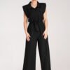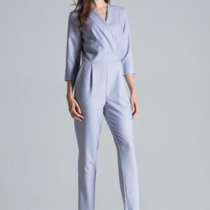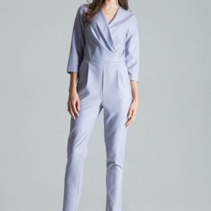 Szary kombinezon z kopertowym dekoltem, rękaw 3/4. Kombinezon przeszyty w pasie z zakładkami. Boczne wsuwane, skośne kieszenie. Zapinany z tyłu na zamek.