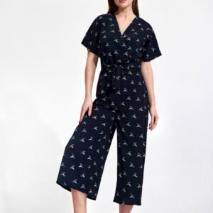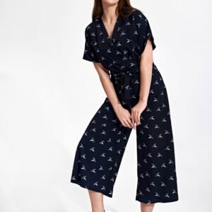 Kombinezon z krótkim kimonowym rękawem. Kopertowy dekolt, w pasie wszyta cienka gumka z ozdobnym wiązaniem, długość nogawek 7/8. Bez zapięcia, bez kieszeni.