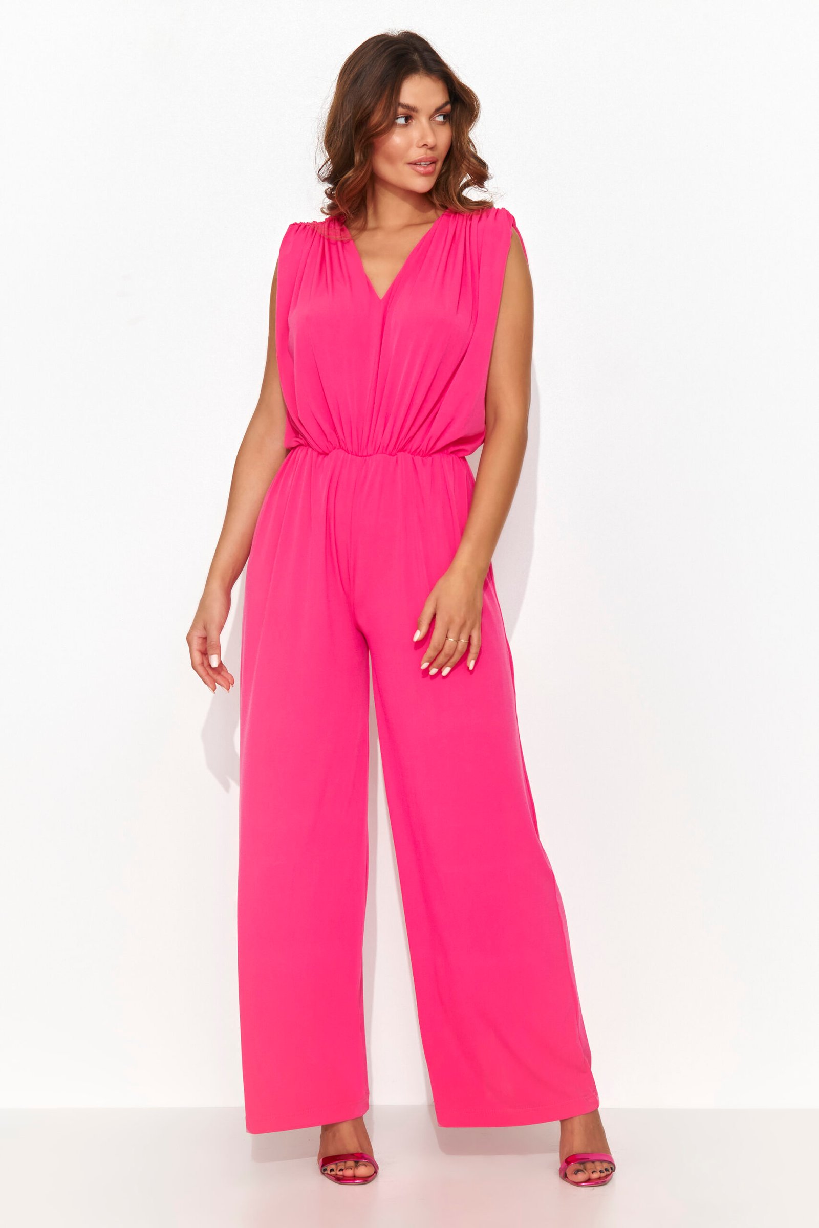 Elegancki kombinezon damski dostępny w sześciu wyjątkowo ponadczasowych kolorach. Swobodny fason zapewnia wygodę i komfort noszenia. Na wysokości ramion posiada szykowne marszczenia. Dekolt w serek nie tylko podkreśla biust, ale także optycznie wydłuża szyję, dodając subtelnej elegancji. Długie i szerokie nogawki to ponadczasowe rozwiązanie modowe, które doskonale komponuje się z różnym obuwiem. Kombinezon wykonany jest ze śliskiego i niezwykle przyjemnego w dotyku materiału, co sprawia, że noszenie go to prawdziwa przyjemność. To idealny wybór dla kobiet ceniących klasykę i wygodę w jednym.