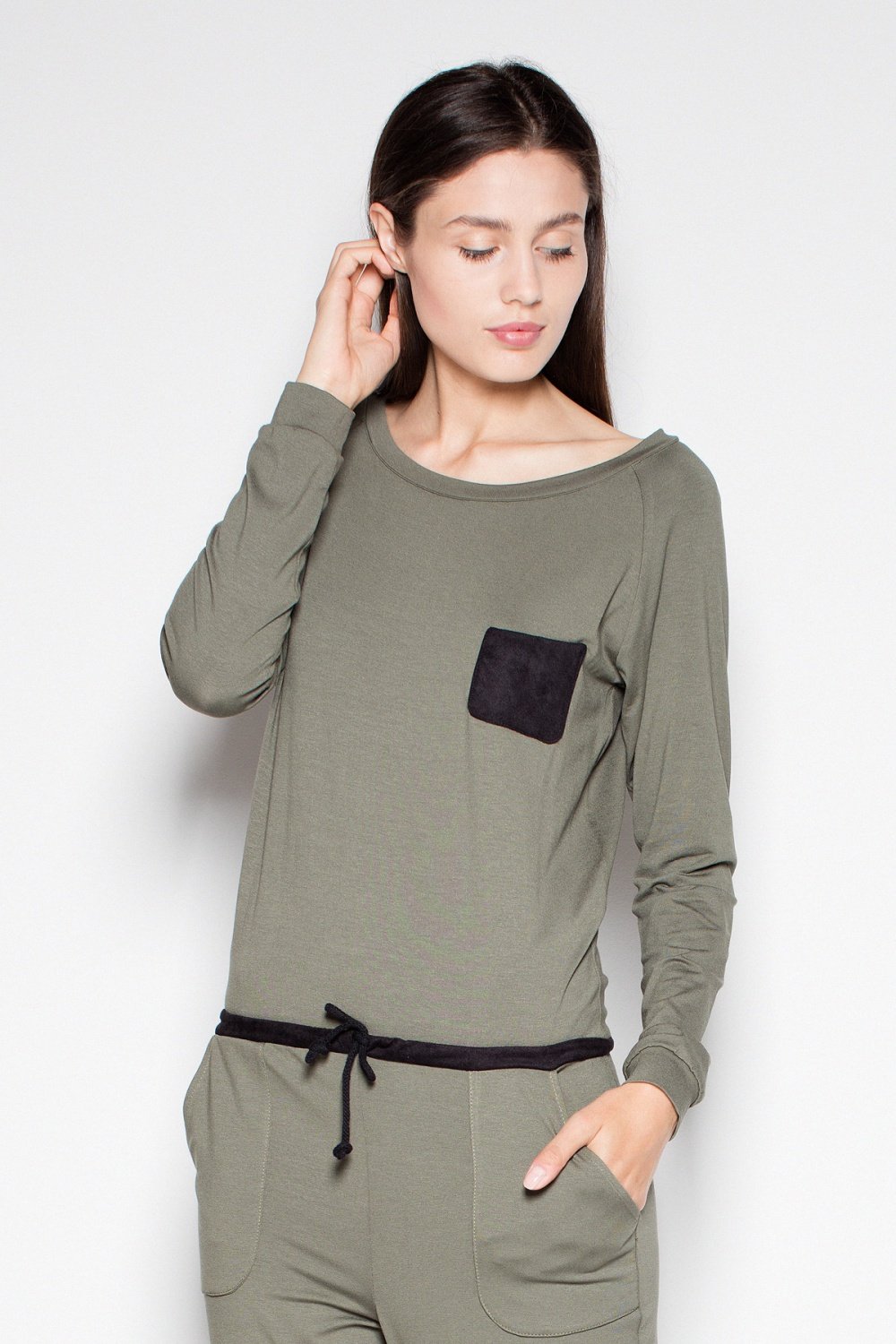 Szykowny kombinezon z długim rękawem oraz długimi nogawkami. Charakteryzuje się kieszonką i paskiem w kontrastującym kolorze. Bardzo wygodny a zarazem niezwykle elegancki.