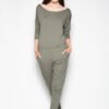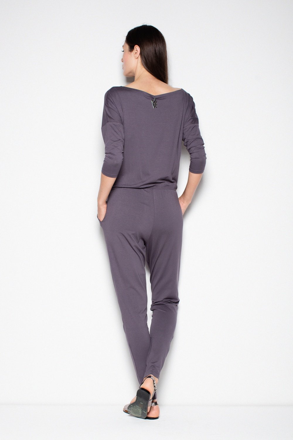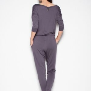 Sportowy kombinezon z półokrągłym dekoltem i opadającymi rękawami, odcinany w pasie. Klasyczny krój.