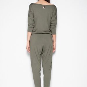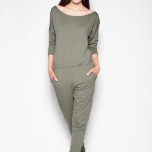 Sportowy kombinezon z półokrągłym dekoltem i opadającymi rękawami, odcinany w pasie. Klasyczny krój.