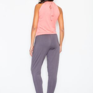 Świetny kombinezon stworzony z połączenia dwóch kolorów. Gładki, lekko lejący się materiał podkreśla figurę. W talii subtelna gumeczka. Z tyłu wiązany na szyi, tworząc łezkę. Z pewnością nie może jej zabraknąć w Twojej garderobie! Model dostępny w trzech pięknych kolorach. Zdjęcie detal przedstawia tył modelu.