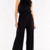 Kombinezon z szerokimi nogawkami, dekolt przodu i tyłu marszczony na wiązanej stójce. Na plecach rozcięcie do pasa, który jest marszczony szeroką gumą. Kombinezon uszyty na elastycznej podszewce. Kombinezon wyprodukowana w Polsce.