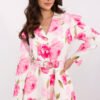 Elegancki damski kombinezon to stylowa propozycja na wiele okazji idealny do pracy, na wizytowe spotkania czy imprezy. Wykonany z lekkiej i przyjemnej w noszeniu mieszanki poliestru i wiskozy, gwarantuje komfort oraz doskonałe dopasowanie do sylwetki. Modny nadruk w kwiaty nadaje mu kobiecego uroku, a falbanki na ramionach subtelnie podkreślają stylowy charakter. Kombinezon ma długość mini, co dodaje mu lekkości i wdzięku, a długie rękawy oraz klasyczny kołnierzyk wprowadzają elegancki akcent. Zapięcie na guziki oraz pasek podkreślający talię sprawiają, że całość prezentuje się wyjątkowo szykownie i kobieco. To idealna propozycja dla kobiet ceniących połączenie klasyki z nowoczesnym designem.