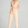 Luźny kombinezon o klasycznym fasonie. Góra bez ramiączek, z kontrastującą wstawką, dół z długimi nogawkami oraz ozdobnymi marszczeniami. Kombinezon posiada kieszenie wsuwane.