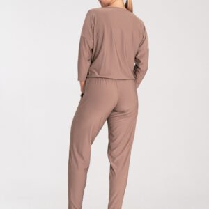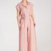 Kombinezon o luźnym fasonie z długimi, zwężanymi nogawkami oraz rękawem 3/4. Ściągany i wiązany w pasie. Dekolt w łódkę.