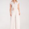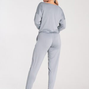 Kombinezon o luźnym fasonie z długimi, zwężanymi nogawkami oraz rękawem 3/4. Ściągany i wiązany w pasie. Dekolt w łódkę.